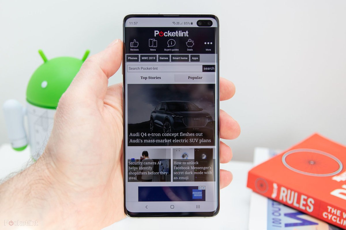 Màn hình Infinity-O trên Galaxy S10 Plus thiết kế đi từ cạnh này sang cạnh khác. Ngoại trừ chiếc cằm hẹp ở phía dưới, S10 Plus hầu như không có bezels. Samsung đã có thể làm điều này bởi vì họ đã sử dụng máy cắt laser để khắc các lỗ ở phía trên bên phải màn hình cho các camera phía trước.